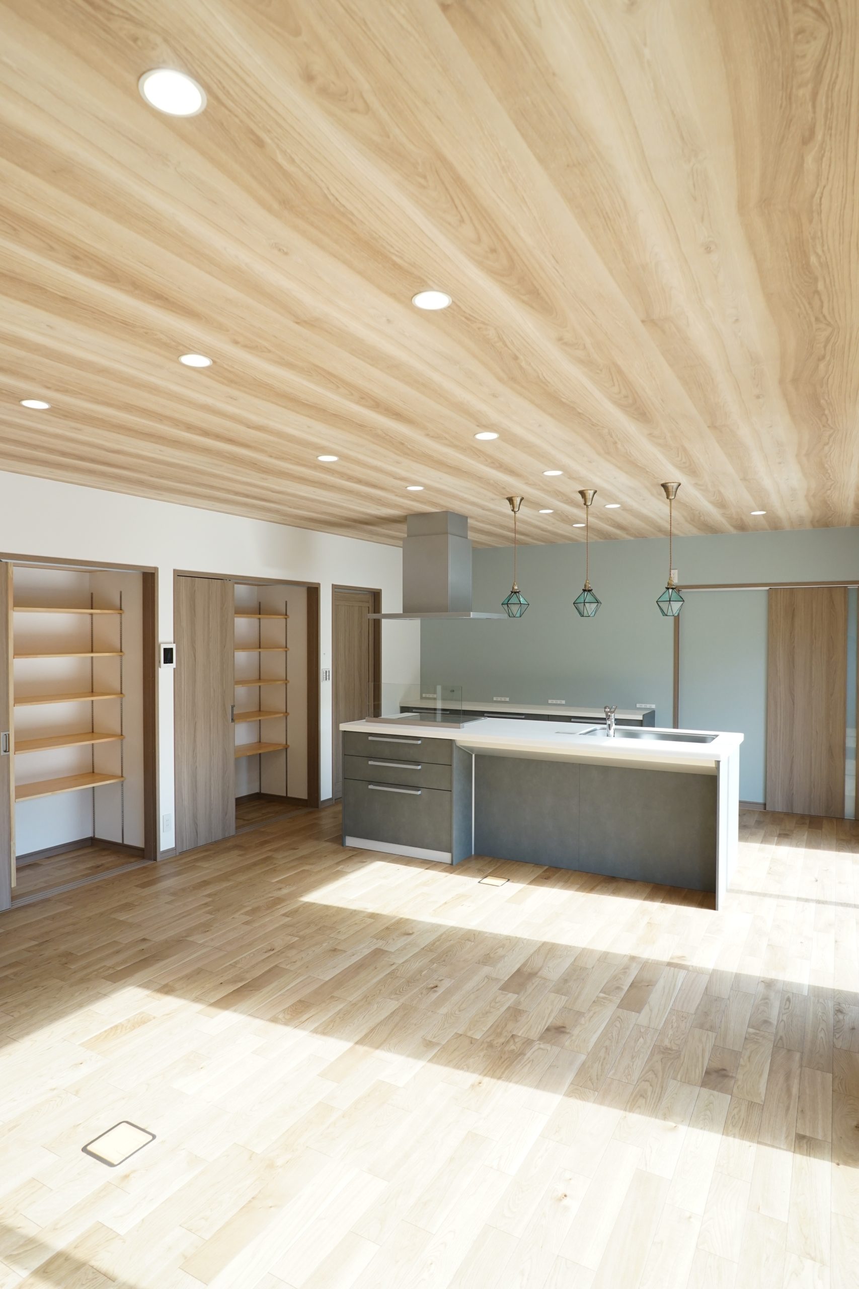 キッチンに立ちながらも、お家に帰ってきたご家族や遊ぶお子さんの様子を見守ることができます。さらに、キッチン横の収納には、大工さん手作りの可動棚。