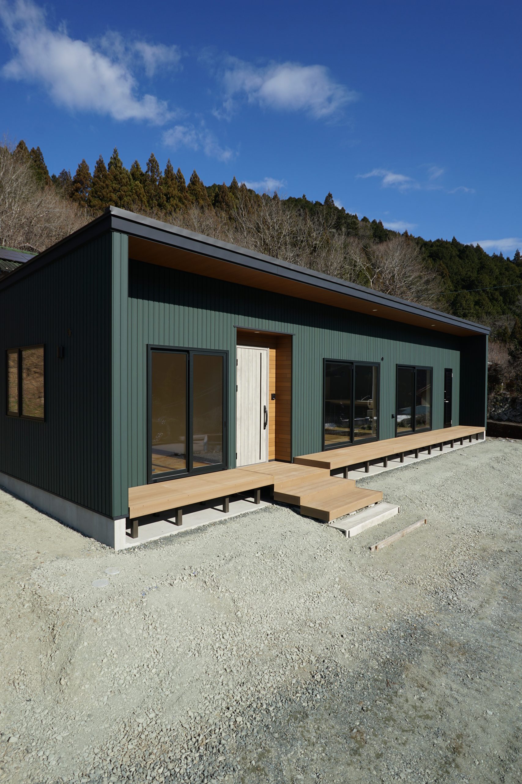 グリーンのガルバリウム鋼鈑の外壁に木目調の軒天、さらに南側全面のウッドデッキと外観も特徴的なスタイル。