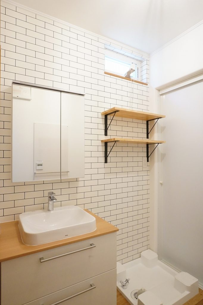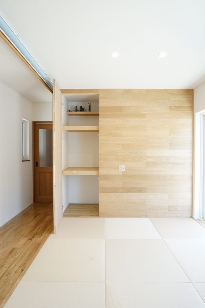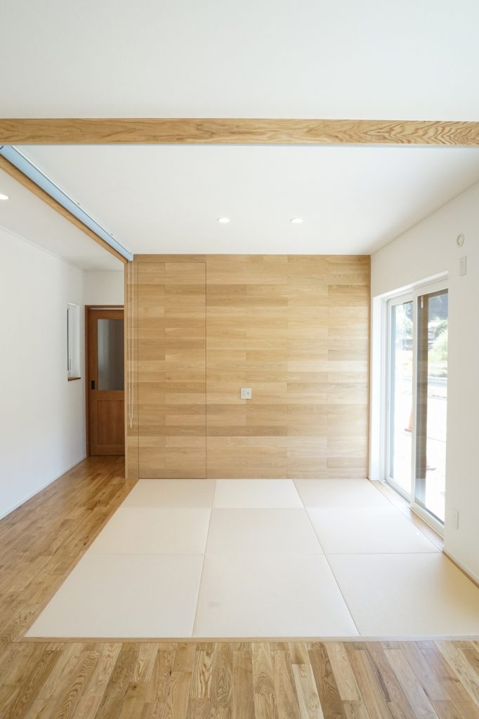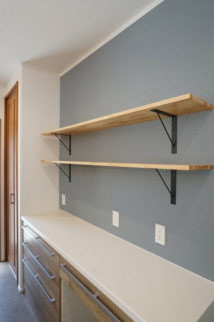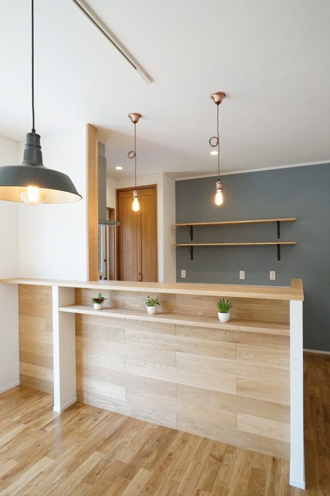 リビングとキッチンの腰壁に板張りを取り入れた、