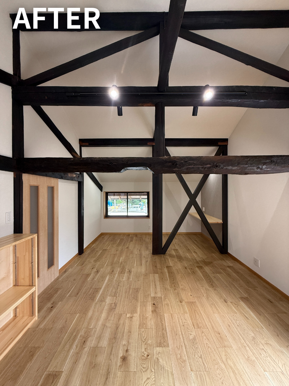 古い梁を活かし、広々とした子ども世帯のリビングへ再生。