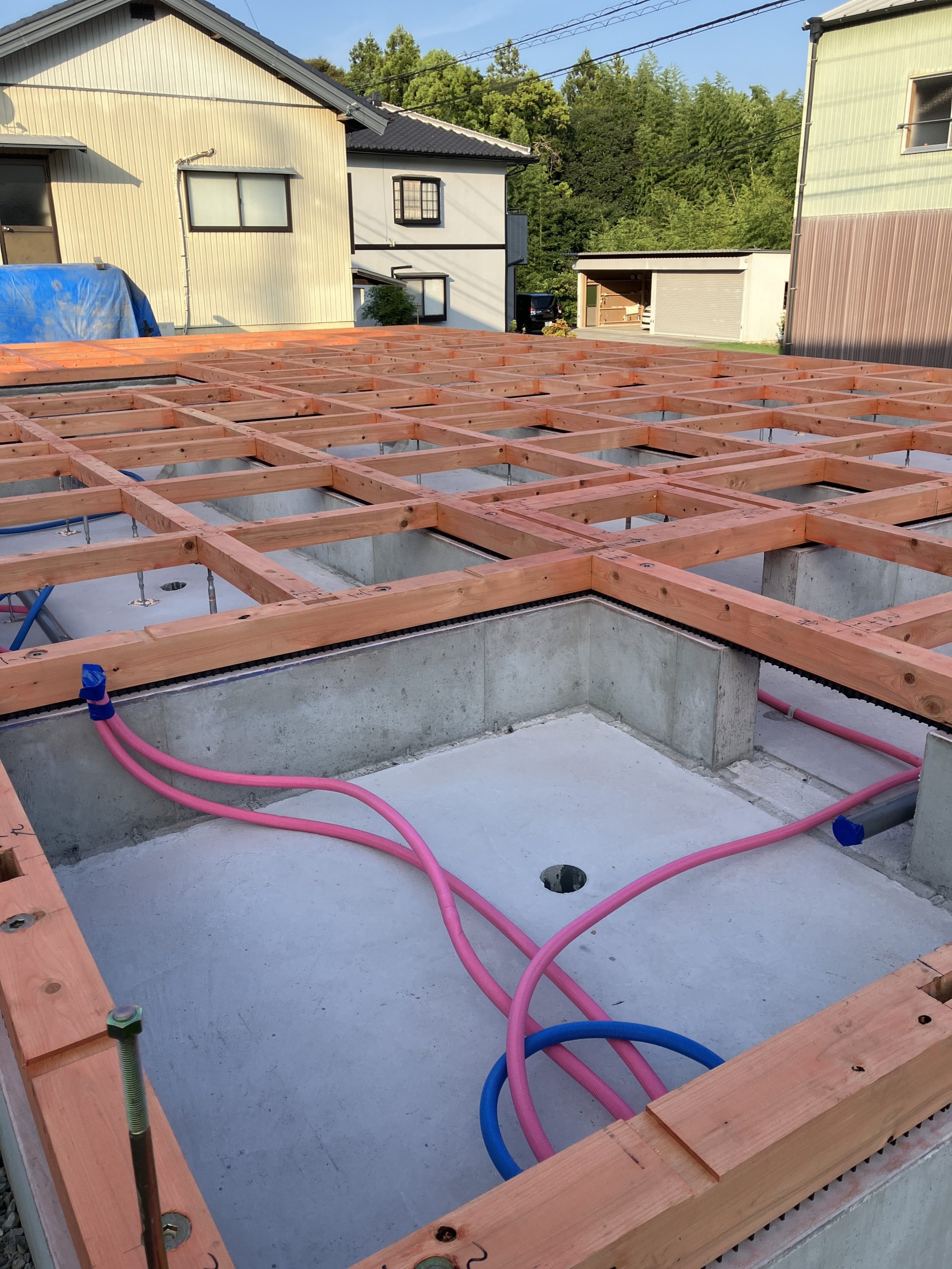 続いて、上棟に向けた準備工事を進めていきます。まずは、基礎上の土台伏せと、水道屋さんに床下の配管施工を行ってもらいました。