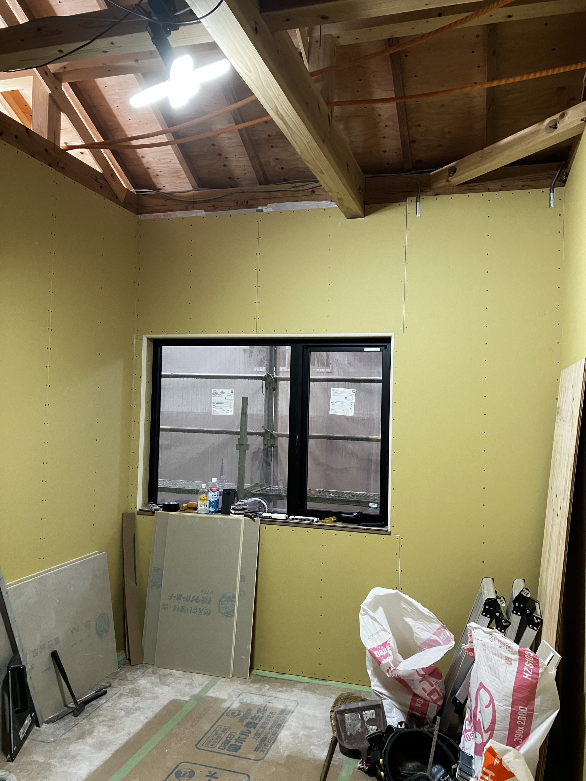 壁に続いて、天井の石膏ボードの施工も完了しました。