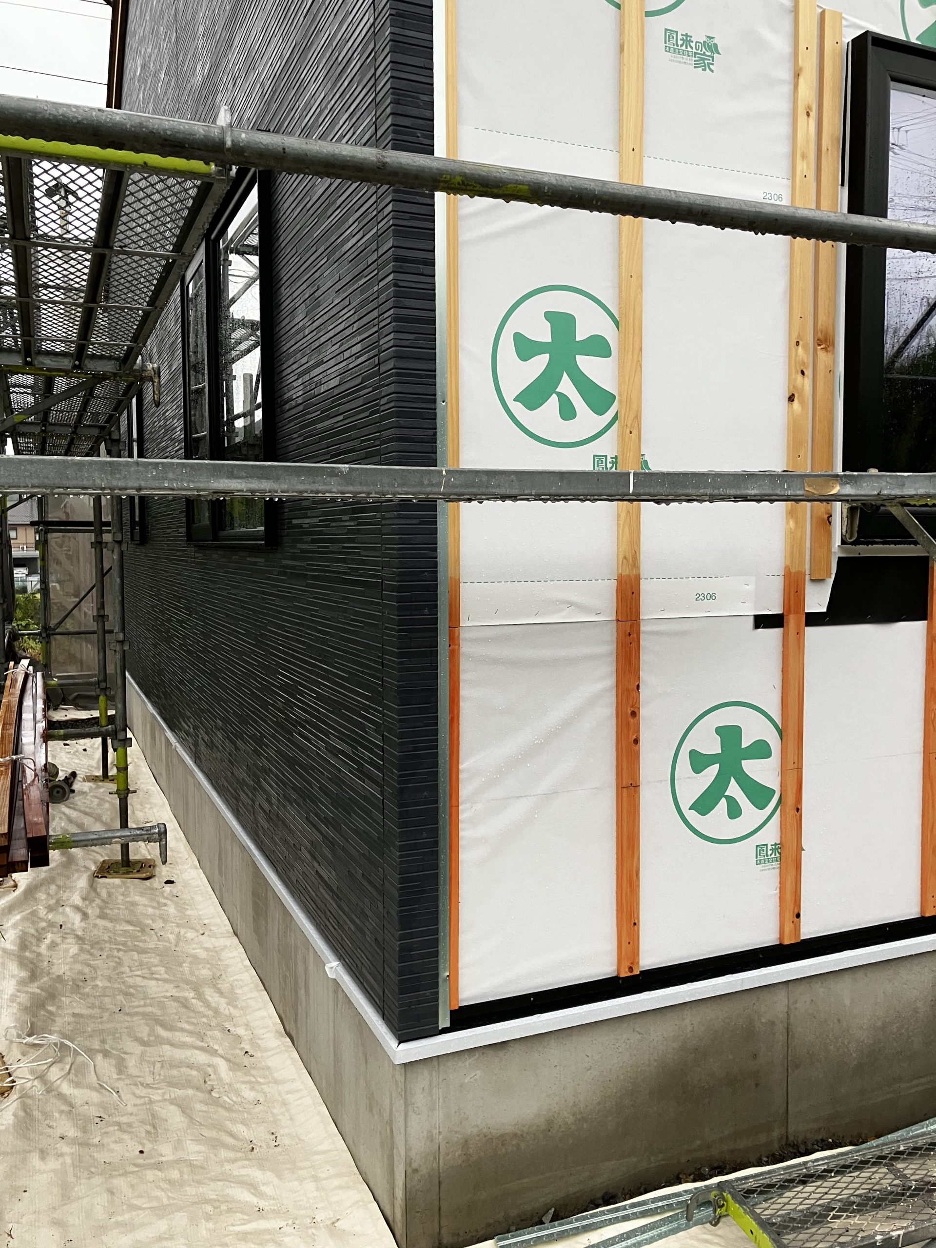 サイディングやガルバリウム鋼鈑など、外壁材では完全に雨水を防ぐことは難しいです。そのため、このシートが、建物を雨水から守ってくれます。この上に、下地胴縁を施工しサイディングを施工していきます。