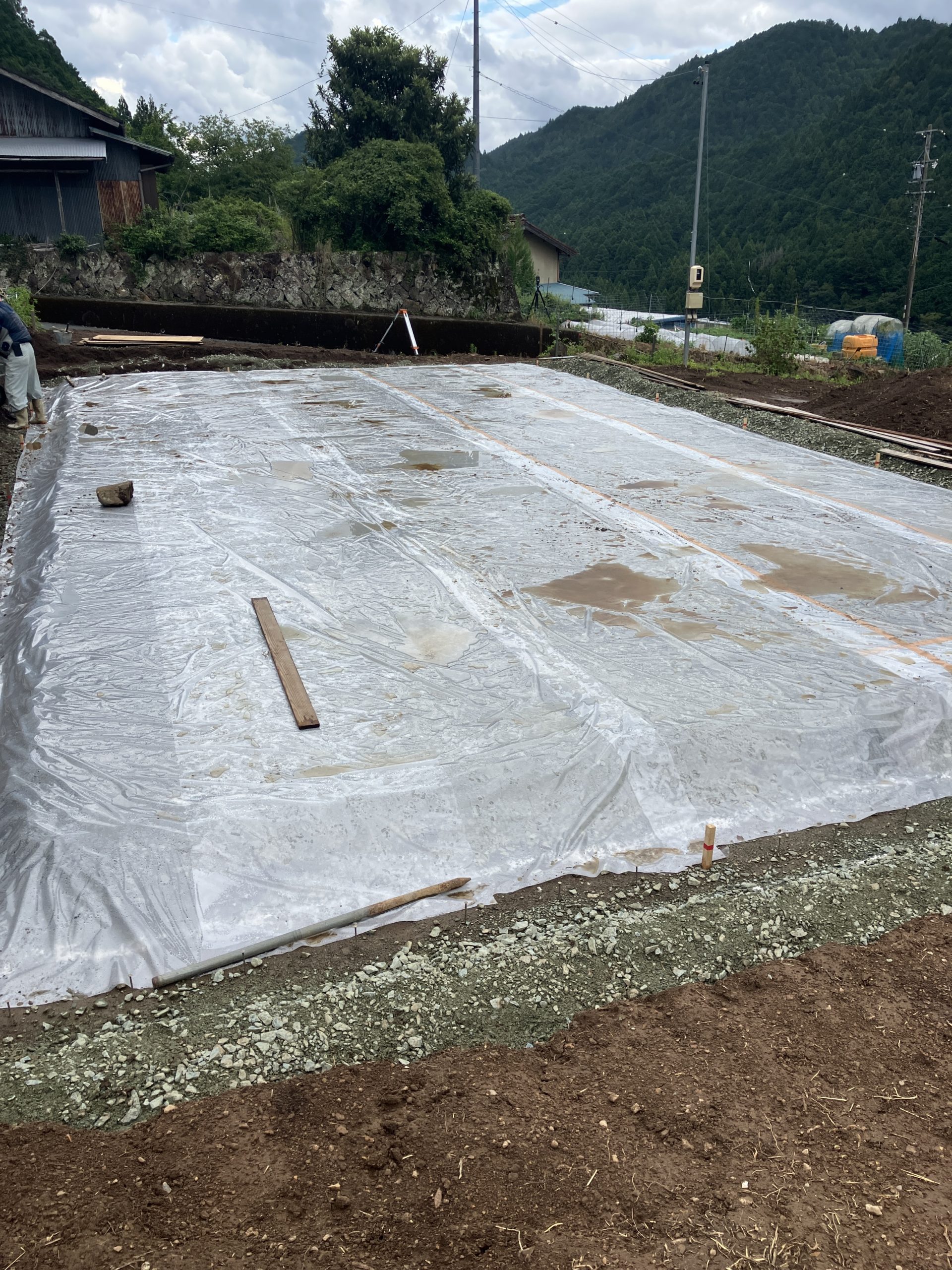 掘り方、砕石転圧が完了したので、防湿シートを施工しました。